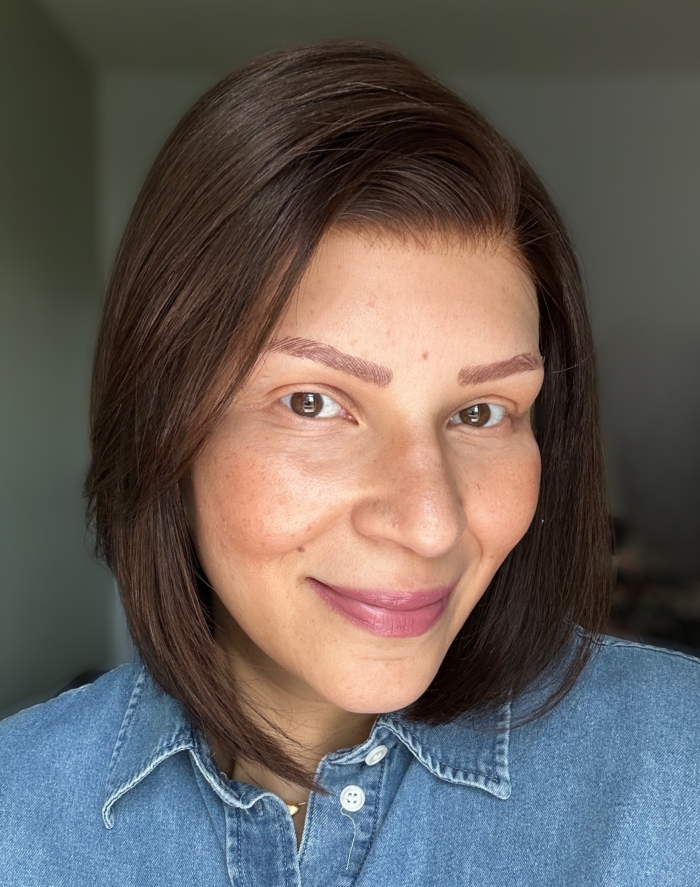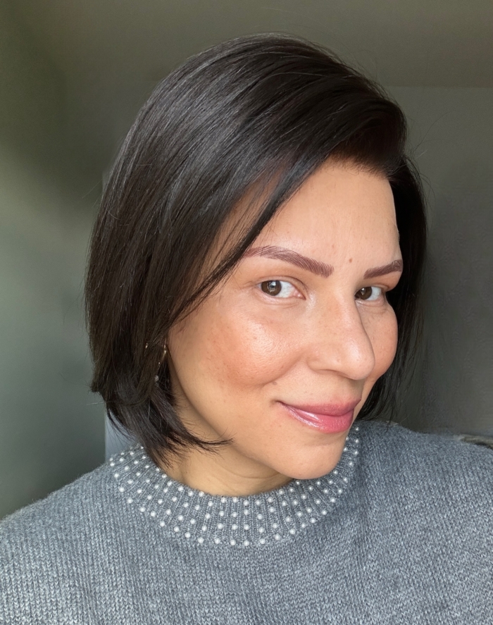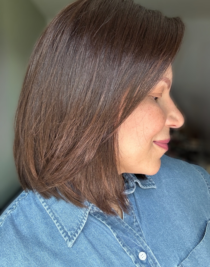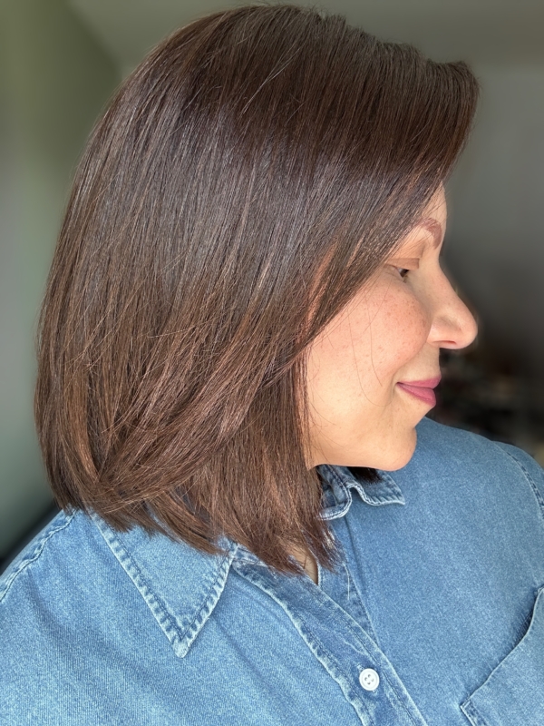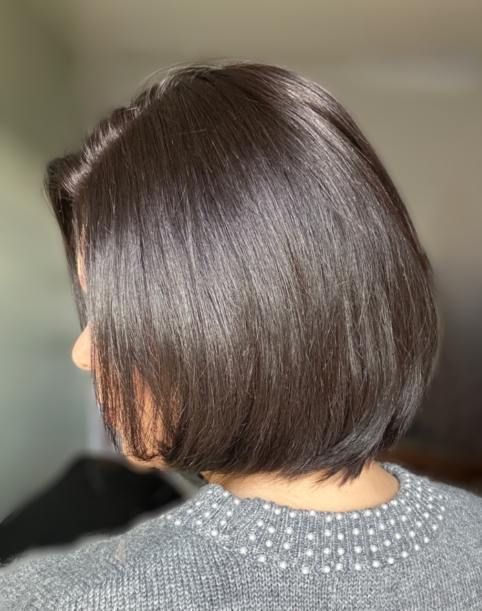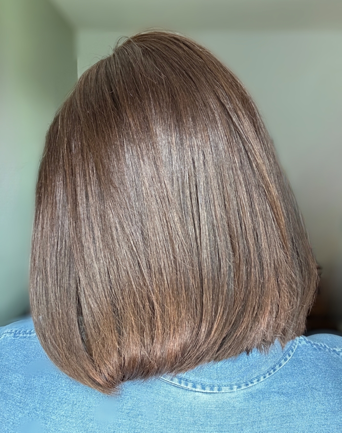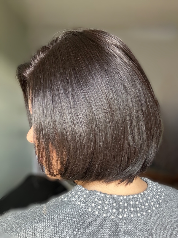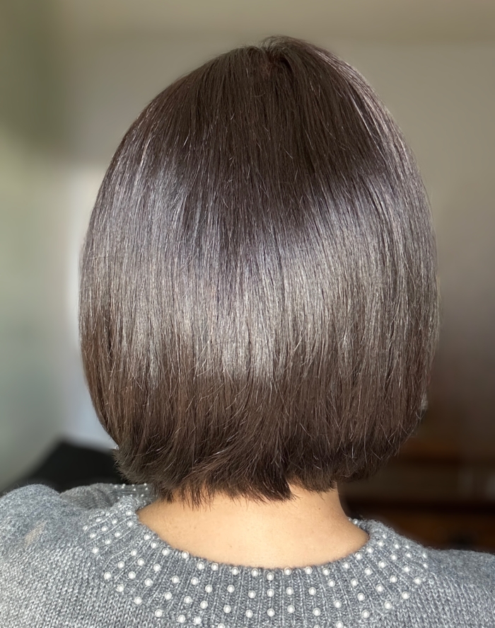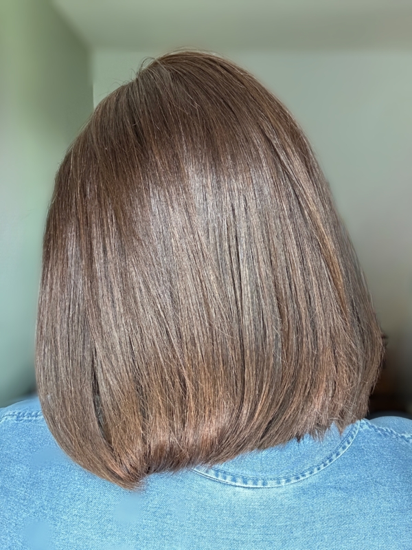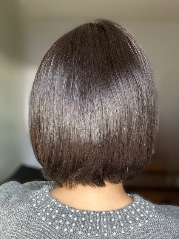 Ayla is our short bob style and can be ordered in Natural Hair Color (darkest brown), in Dark Chocolate or in Ombre Color with darkest brown root melting into a reddish brown base.