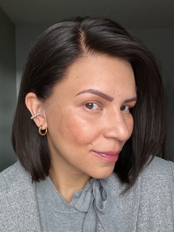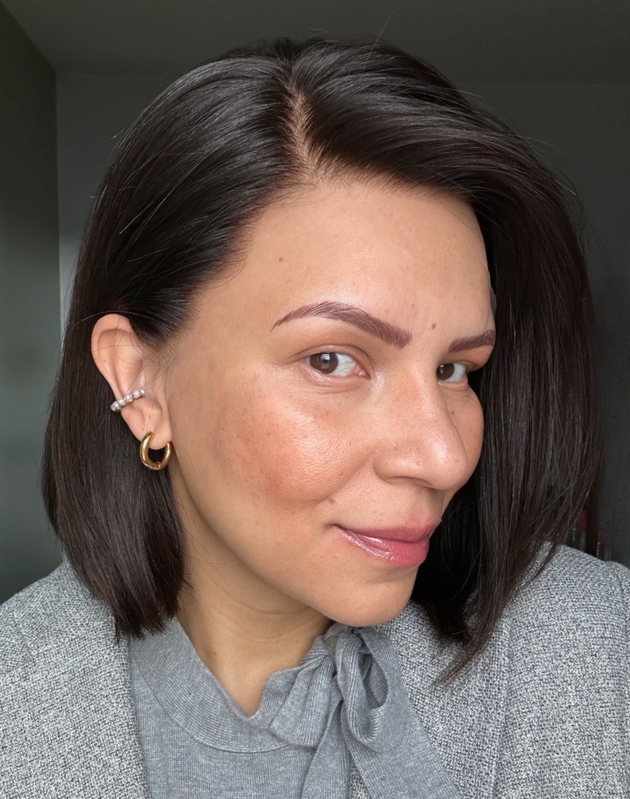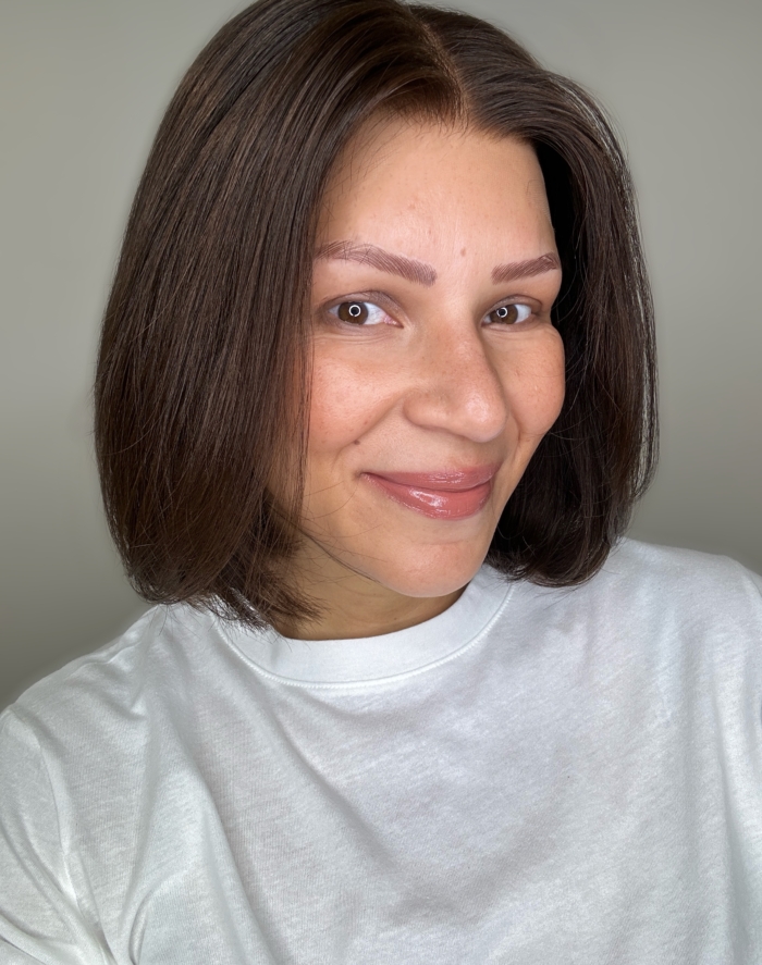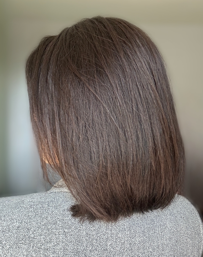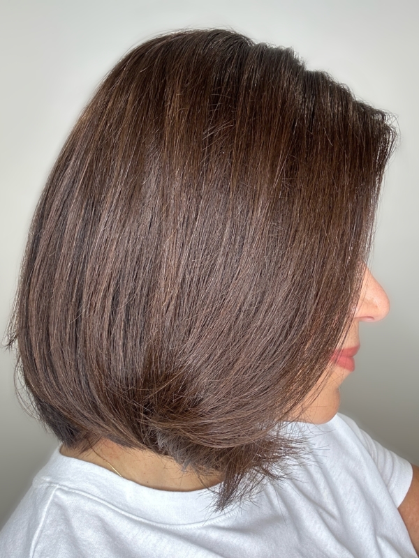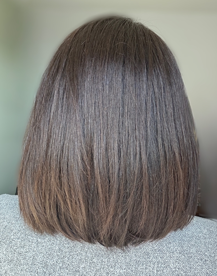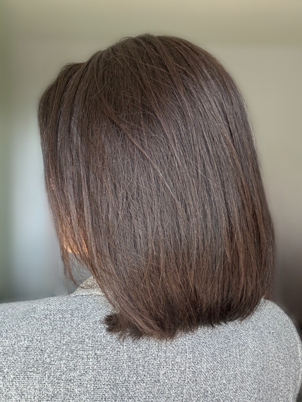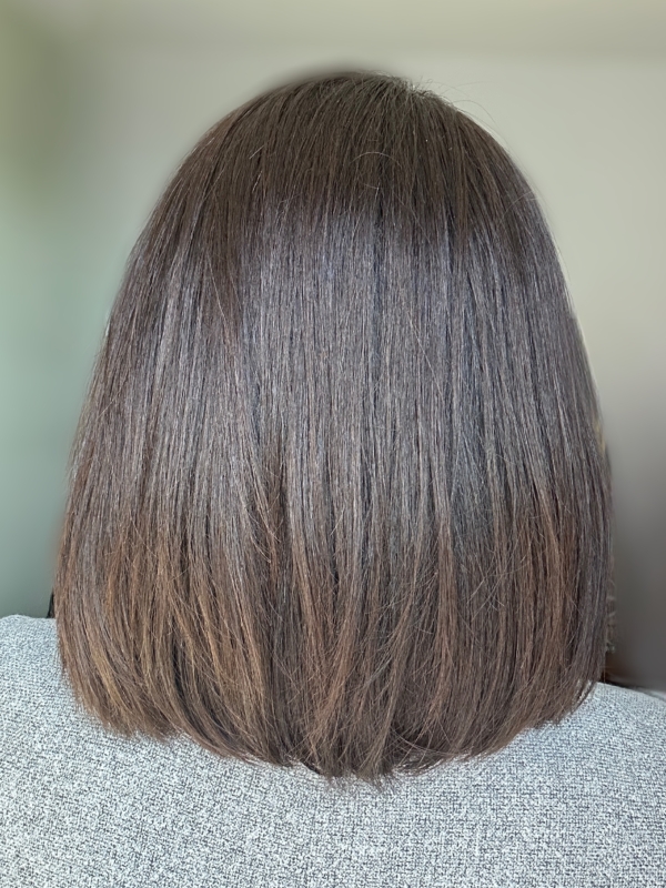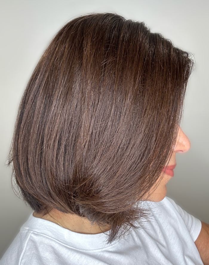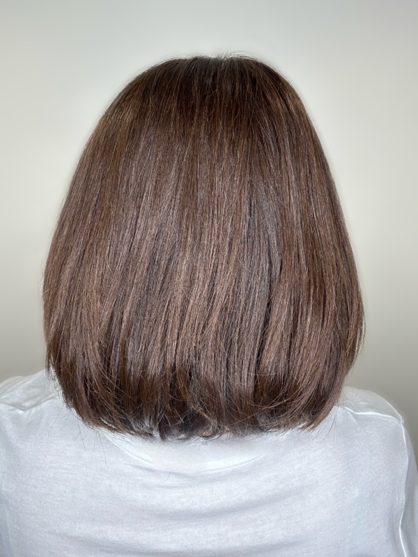 Our sophisticated and effortless chin-length cut can be ordered in Natural Hair color (darkest brown) or in Dark Chocolate color.