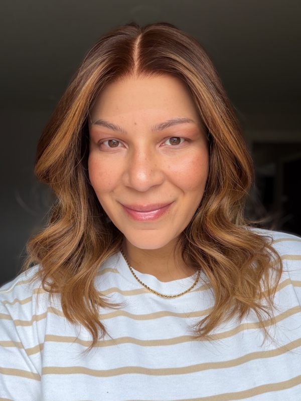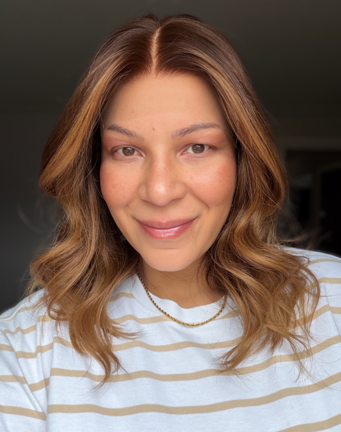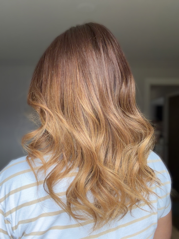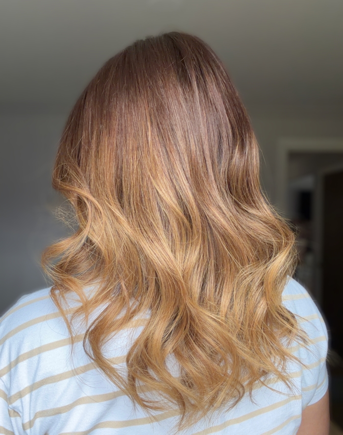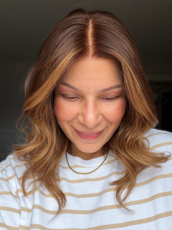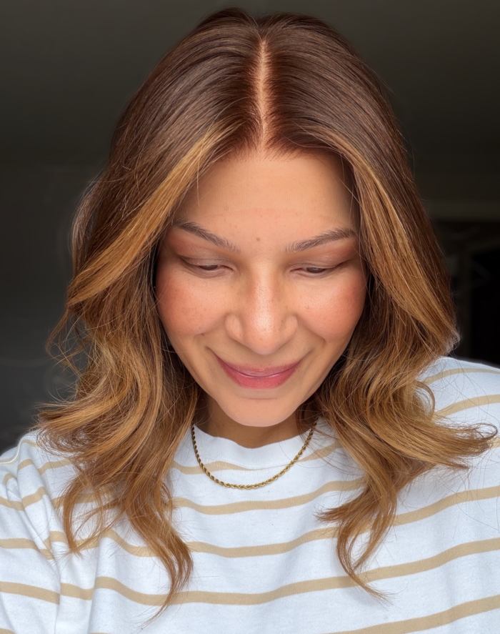 Dark chocolate brown roots with dimensional caramel and honey highlights