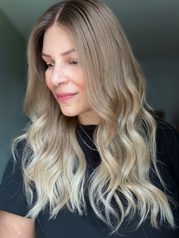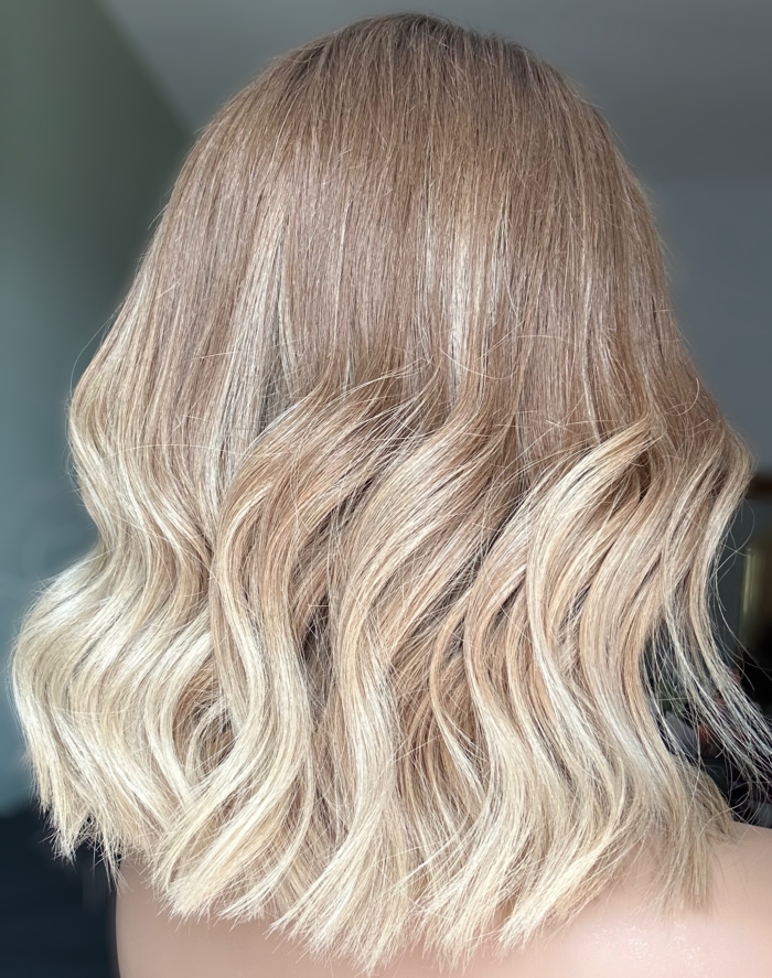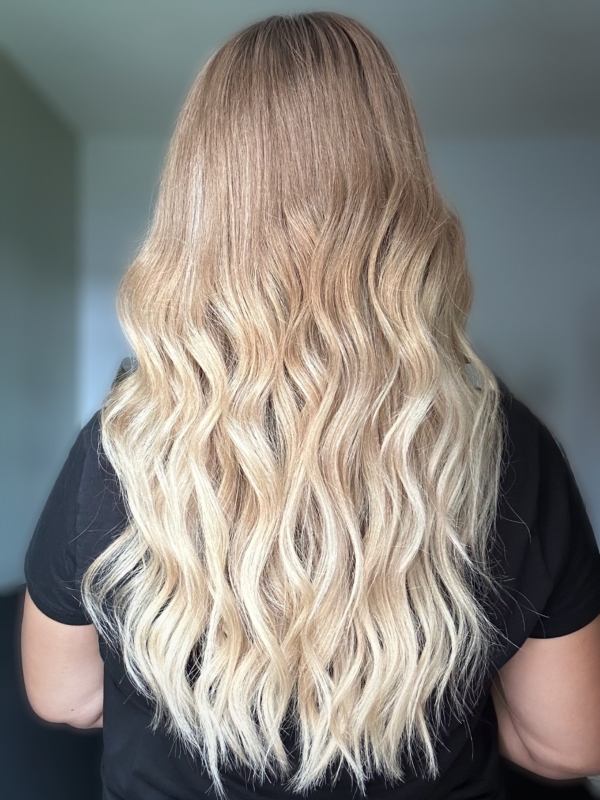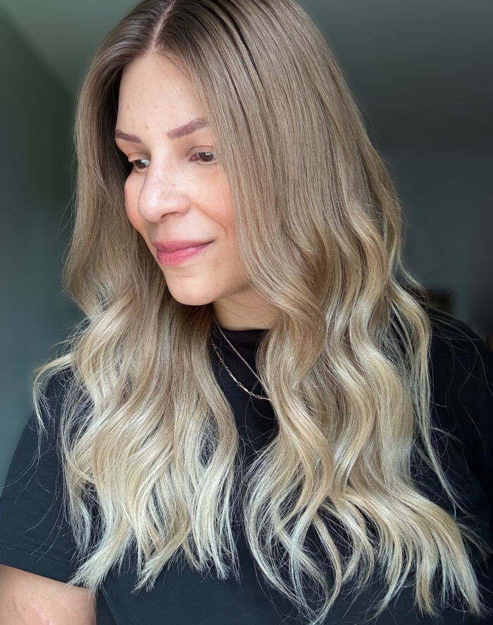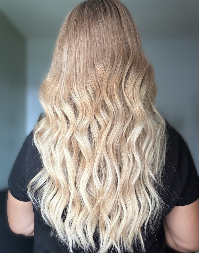 Dark blonde roots transitioning into a medium golden blonde ombre.