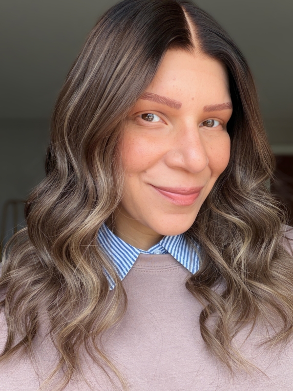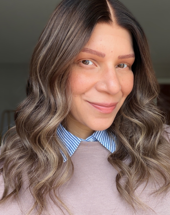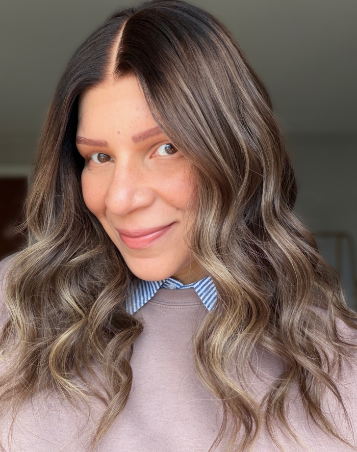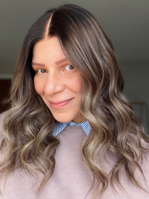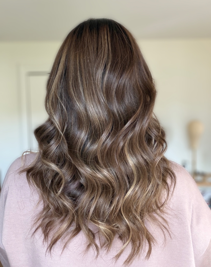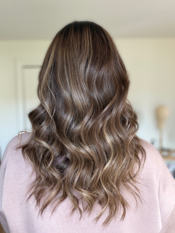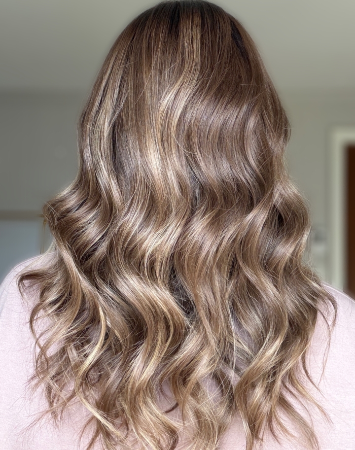 Dark chocolate roots melting into a honey blonde base with dimensional highlights